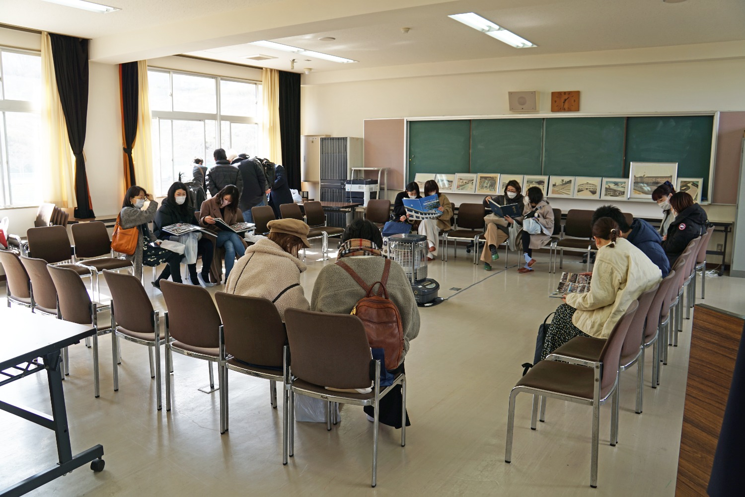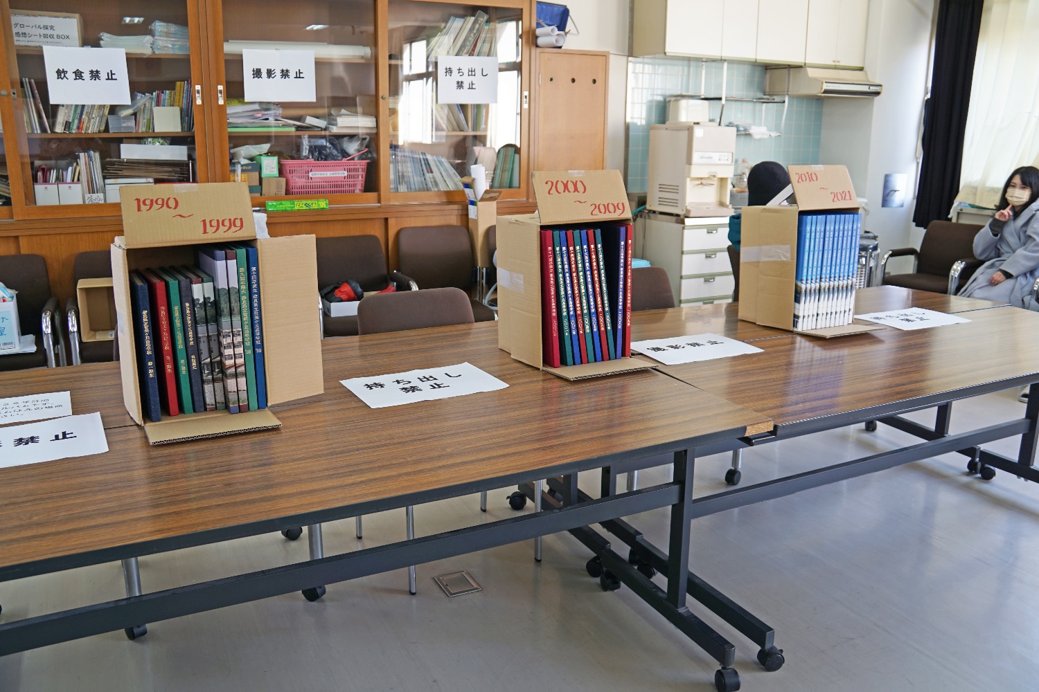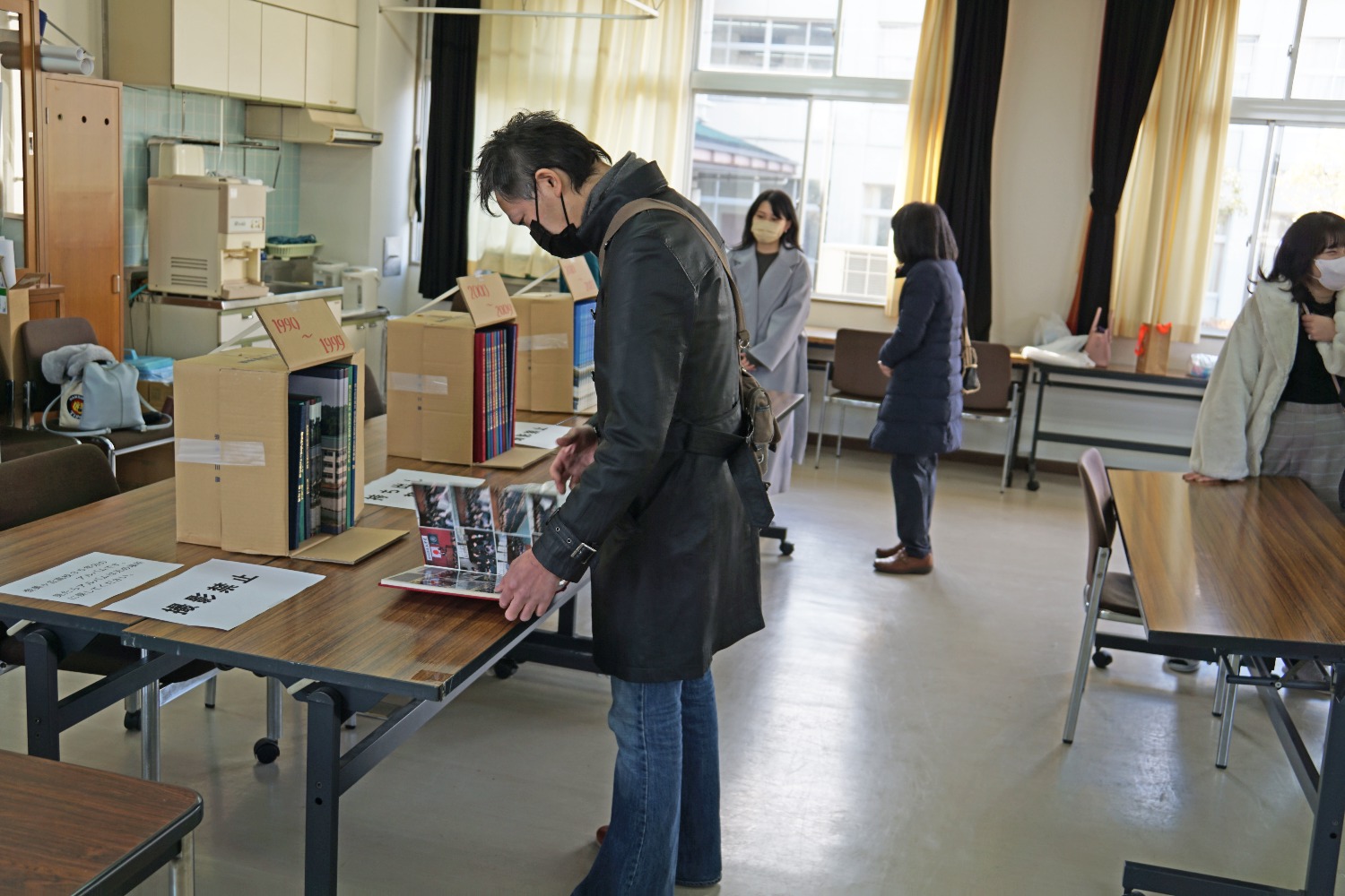 大会議室に各年度の卒業アルバムと制服が展示され、制服を懐かしみながら写真を取られる方や、卒業アルバムを同級生や親子でアルバムを見ながら談笑されていました。