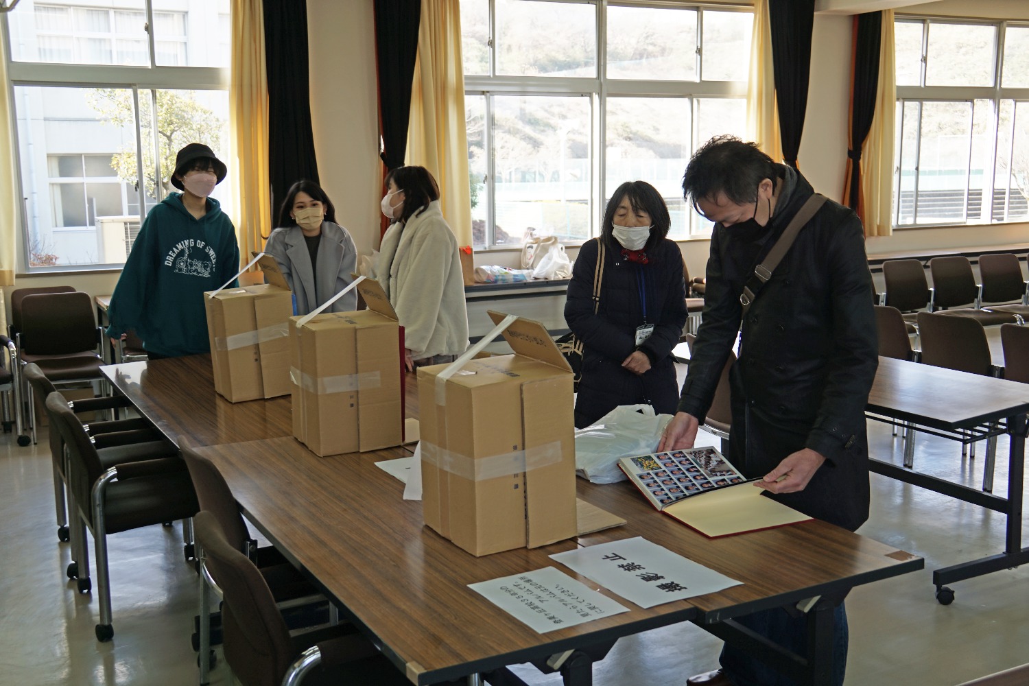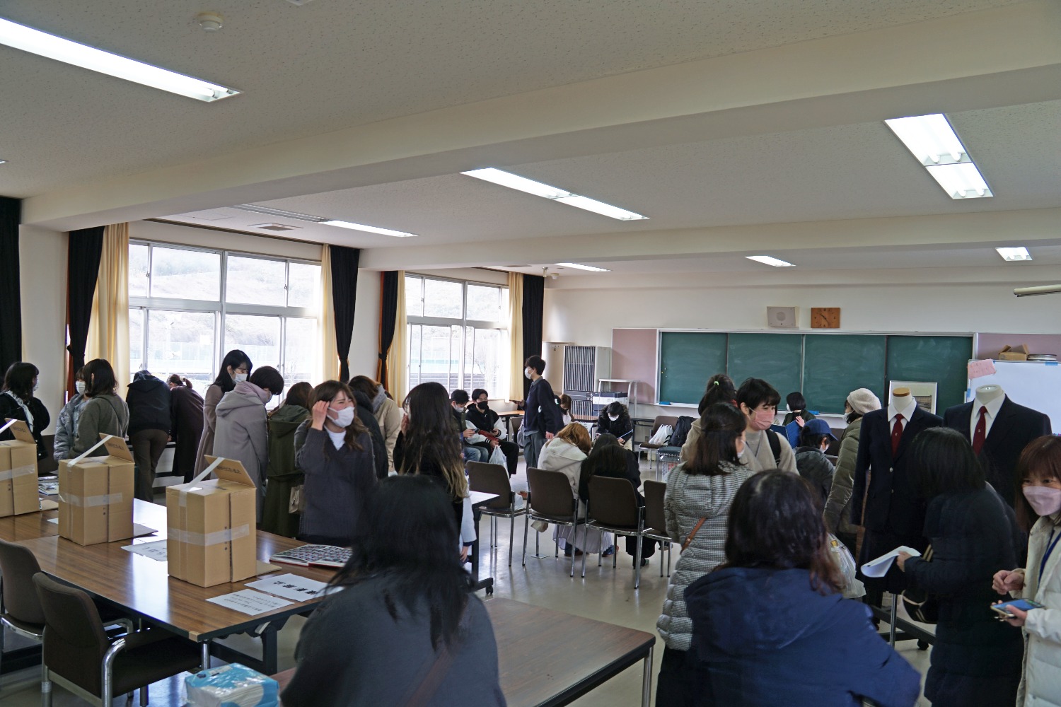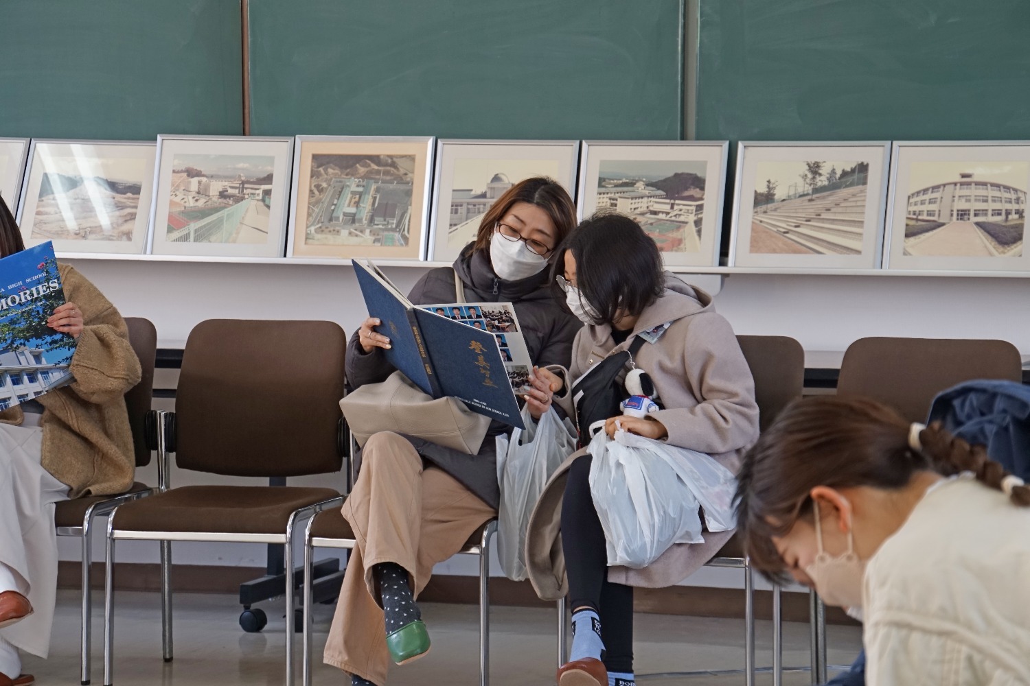 大会議室に各年度の卒業アルバムと制服が展示され、制服を懐かしみながら写真を取られる方や、卒業アルバムを同級生や親子でアルバムを見ながら談笑されていました。