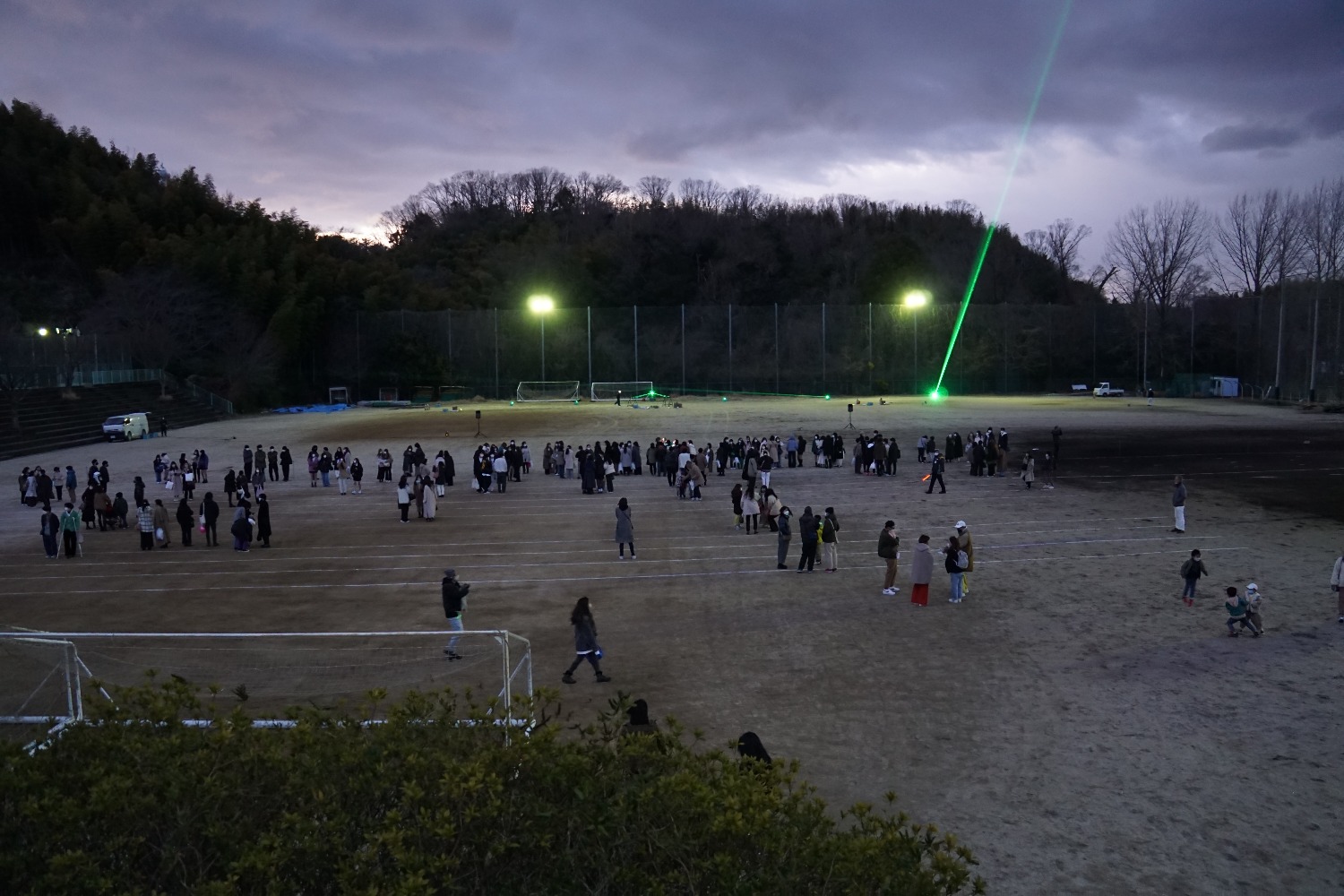 体育館の壁面にレーザー文字投影として「ありがとう 35年の軌跡」「我登美高 これからもずっと」が映し出されました。